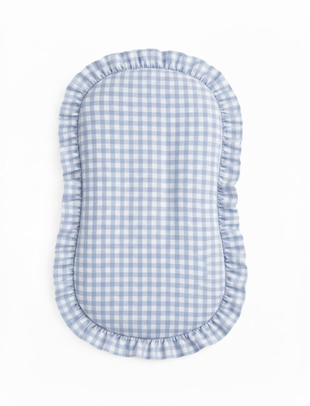 Introducing our Blue Ruffle Baby Lounger Covers which are compatible with the The Snuggle Me® Lounger. Made from luxurious cotton both breathable & soft. Easily washable and ready for sweet moments with your little one. Hidden zipper under ruffle top creating double sided cover use