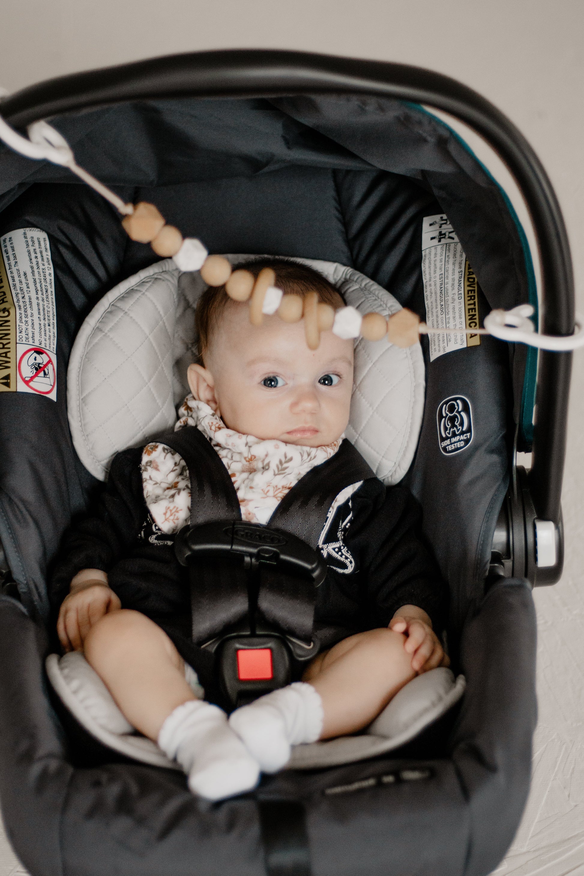 Car Seat Toys that clip easily clip anywhere! Clip to highchairs, prams, stroller bars, and more. Made from high quality Maple wood beads, and BPA-Free / Chemical Free Food Grade Silicone Beads. Comes with 2 Maple wood rings.