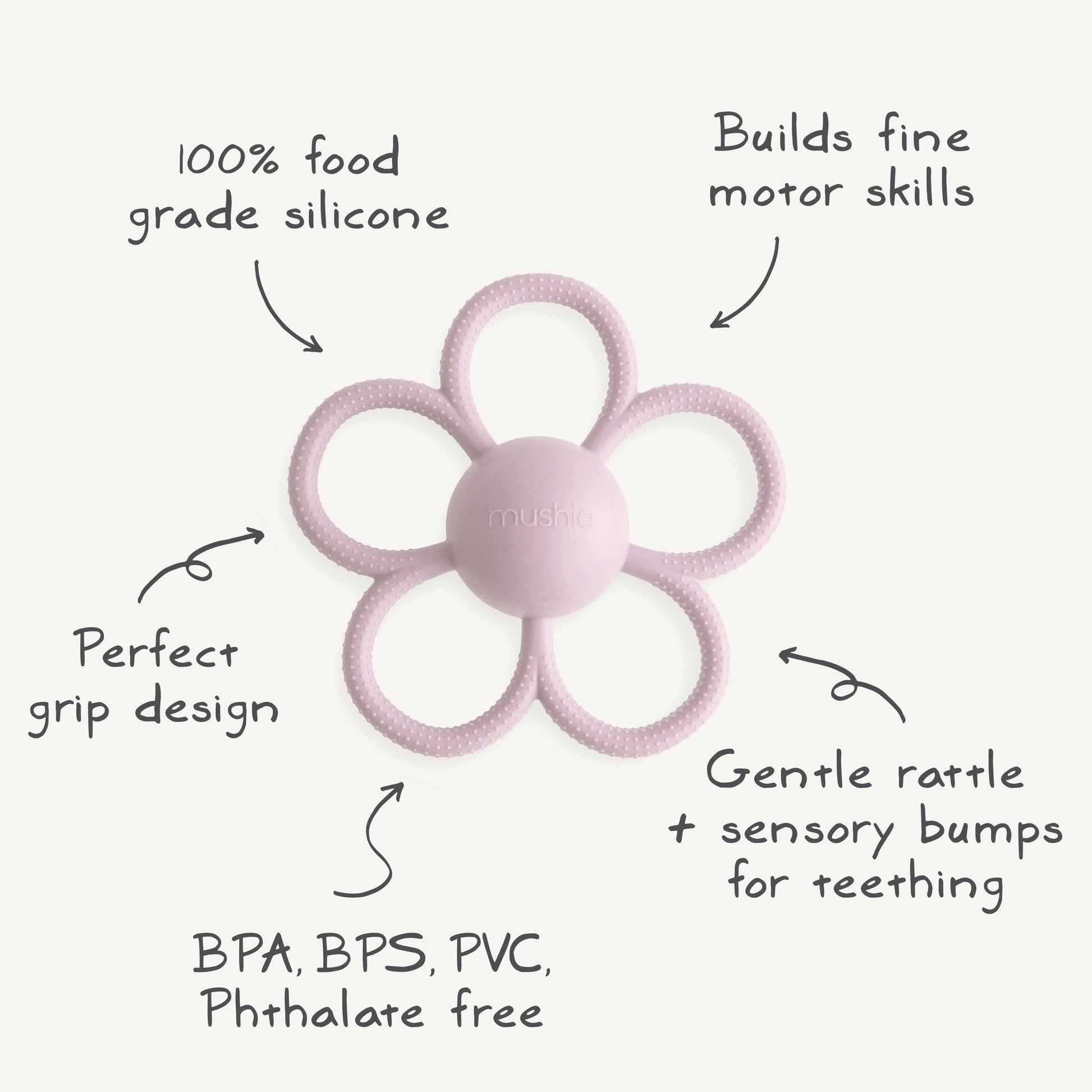 Inspired by nature and designed with functionality and comfort in mind, our silicone Daisy Rattle Teether features a playful flower shape and built-in rattle. The cheerful sound engages baby’s auditory senses for added soothing relief. With handles that are easy for small hands to grasp and a textured silicone surface that massages gums, our rattle teethers are perfect for your little one’s teething journey.
