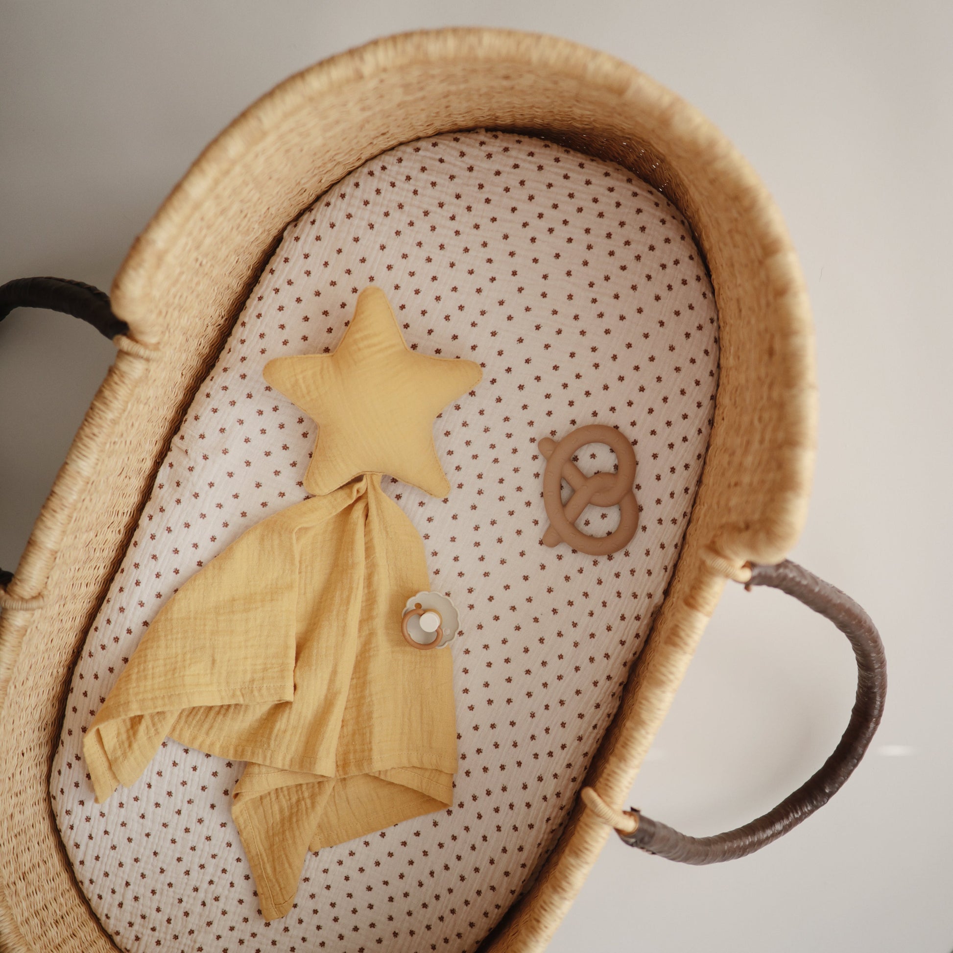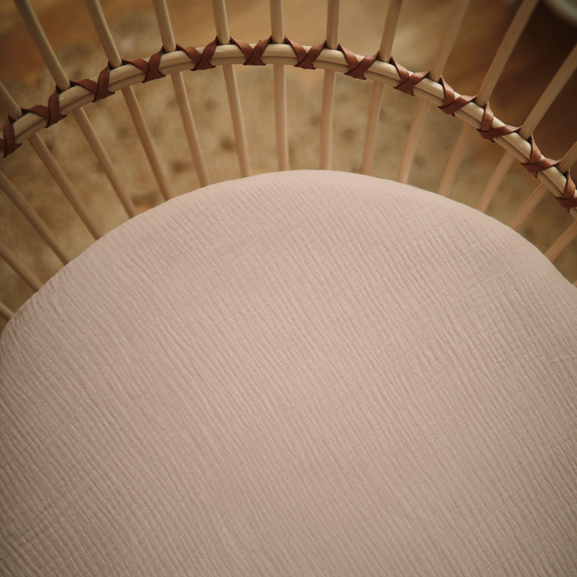 Made from 100% muslin cotton, our cozy, extra soft bassinet crib sheet is pre-washed for lasting softness against your baby’s delicate skin. Muslin fabric stays naturally breathable while keeping your little one warm, comfortable, and cuddly. Sized to fit most standard USA bassinets, this sheet works best with oval, hourglass, and rectangular mattresses for a perfect fit.