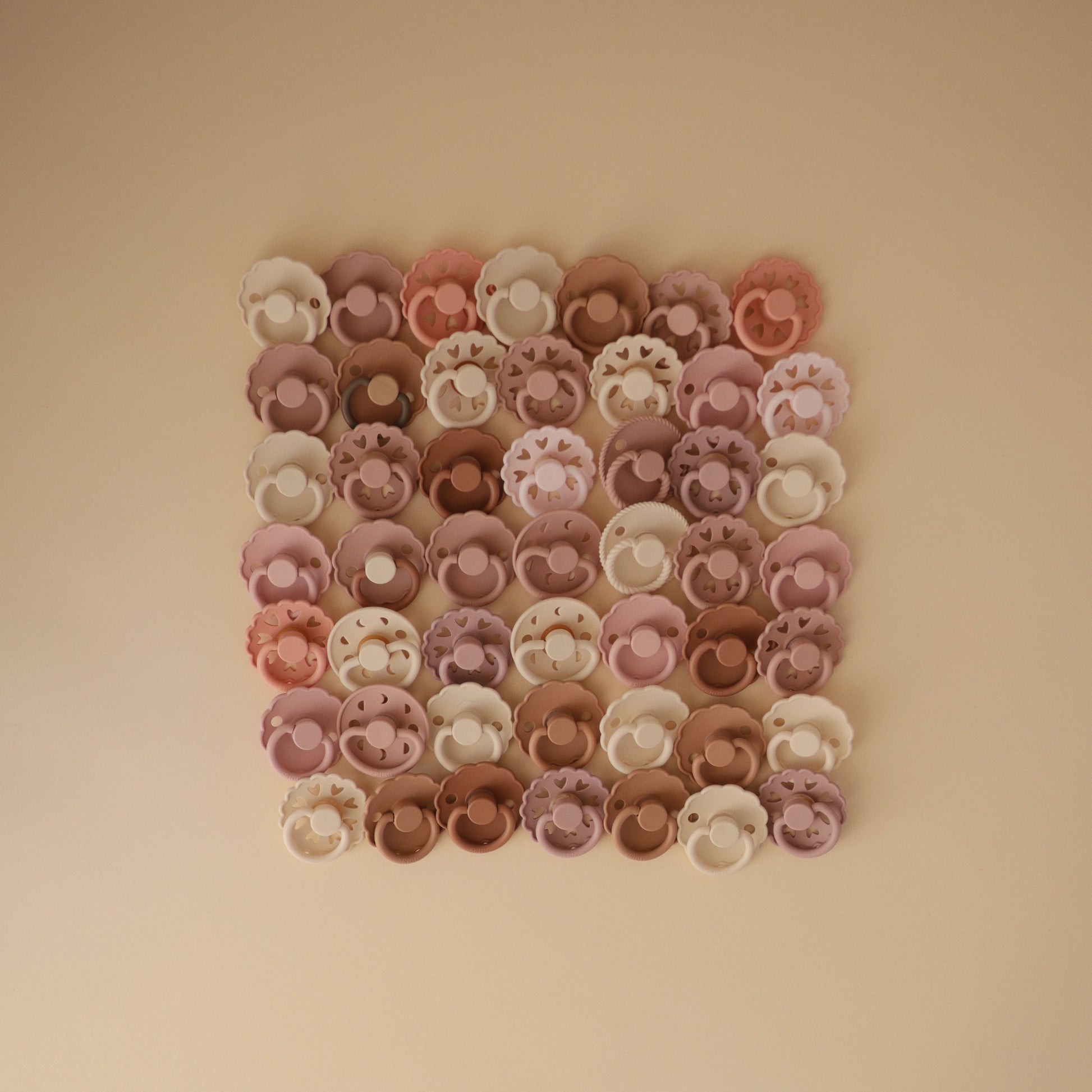 FRIGG Fairytale silicone pacifiers are thoughtfully designed and made in Denmark for your baby's comfort and safety with an improved SilkySoft™ medical grade silicone nipple and patented Click-Lock® system. The outward curve keeps the pacifier off baby's delicate skin while air holes and a security handle give parents extra peace of mind. The beautiful colors and design draw inspiration from timeless fairy tales by Danish author Hans Christian Andersen.