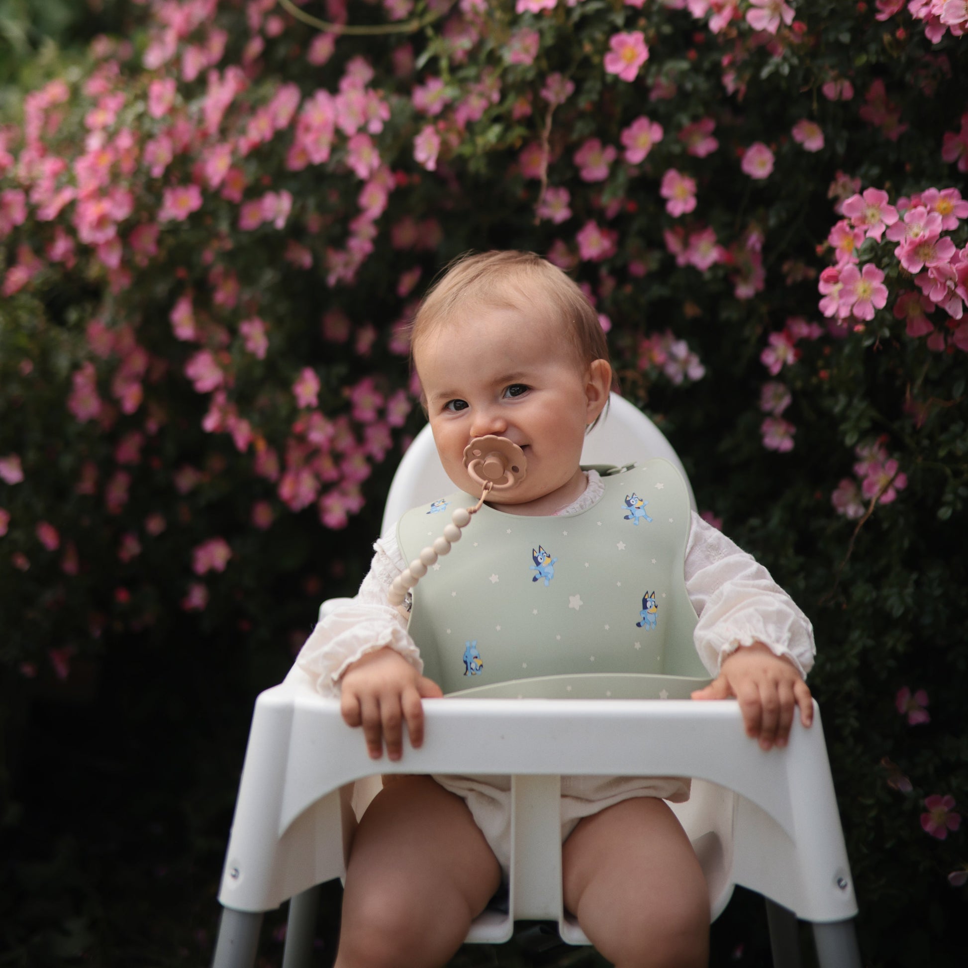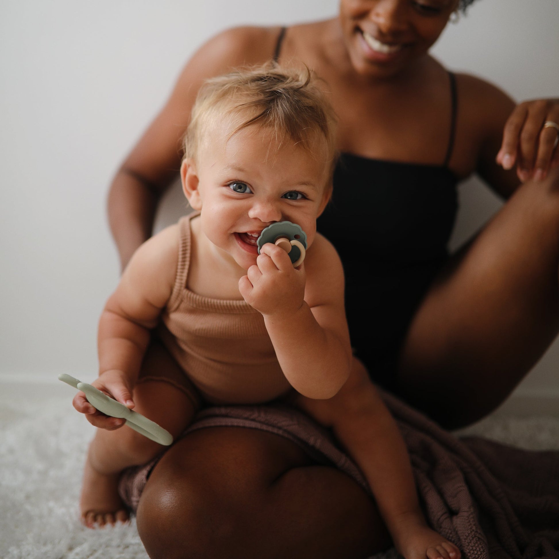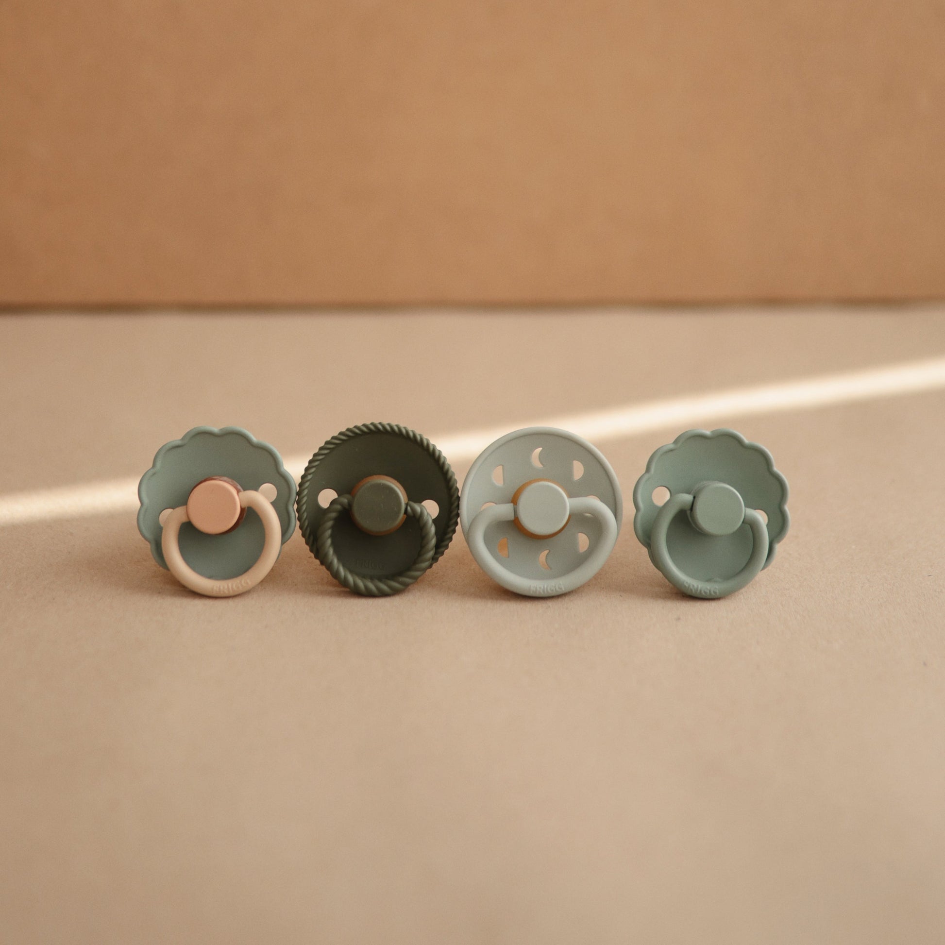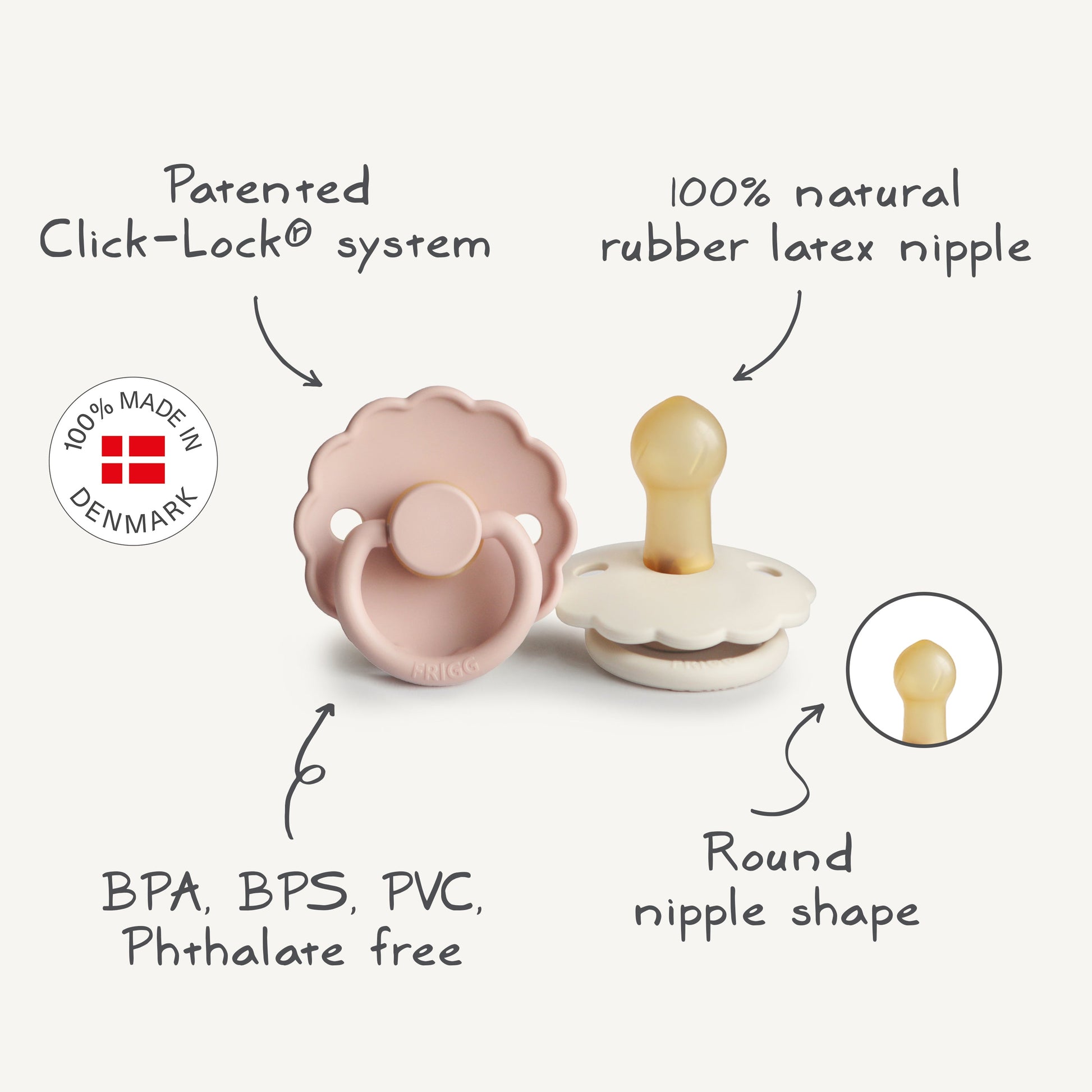 The FRIGG line of Daisy rubber pacifiers are thoughtfully designed and made in Denmark for your baby's comfort and safety with a natural rubber latex nipple and patented Click-Lock® system. The outward curve keeps the pacifier off baby's delicate skin, while air holes and a security handle give parents extra peace of mind. The charming daisy-shaped shield adds a sweet, playful touch to your baby’s everyday essentials.