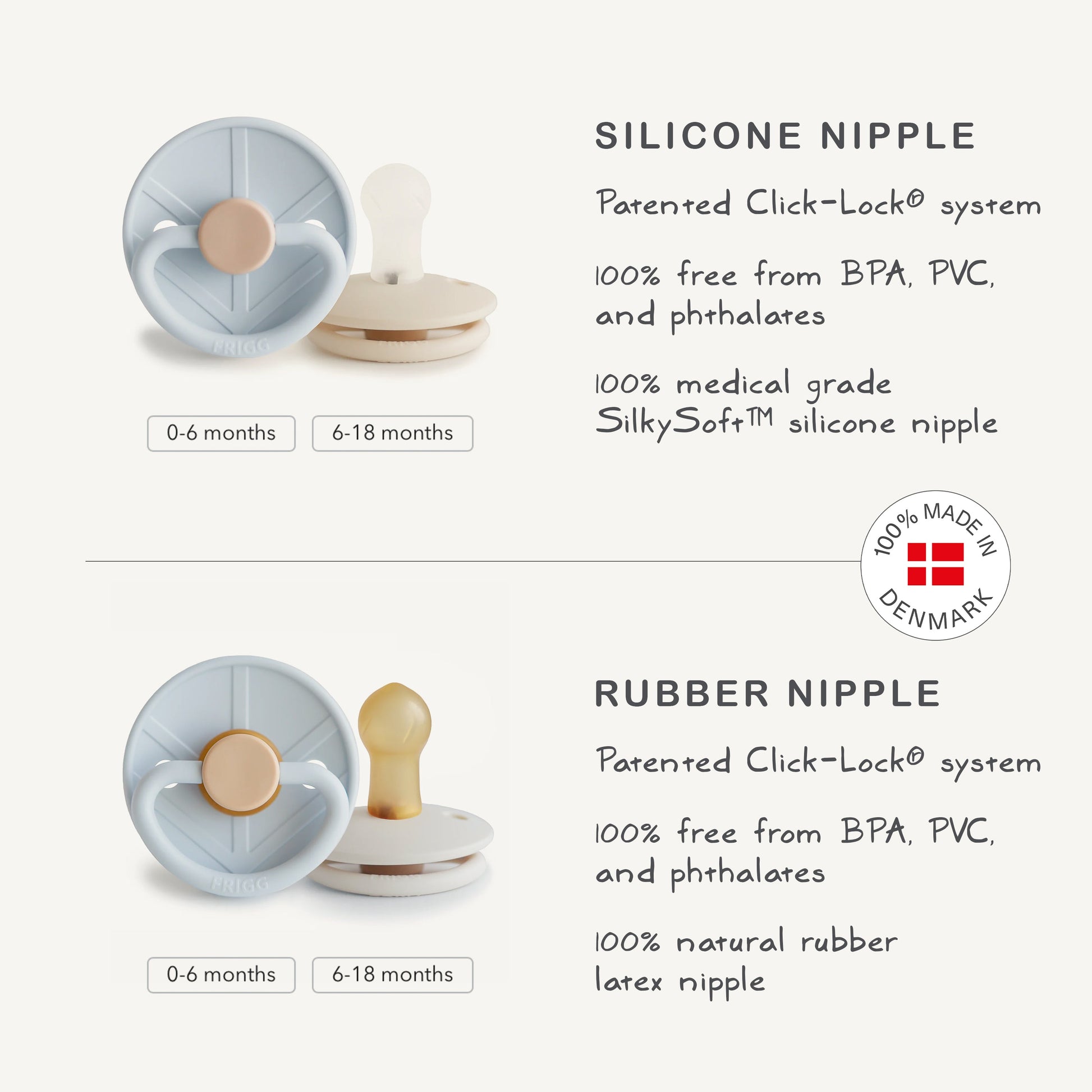 FRIGG silicone pacifiers are thoughtfully designed and made in Denmark for your baby's comfort and safety with an improved SilkySoft™ medical grade silicone nipple and patented Click-Lock® system. The outward curve keeps the pacifier off baby's delicate skin, while air holes and a security handle give parents extra peace of mind. The set includes a variety of six pacifiers in a curated palette—perfect for rotating through the week or gifting to a new parent.