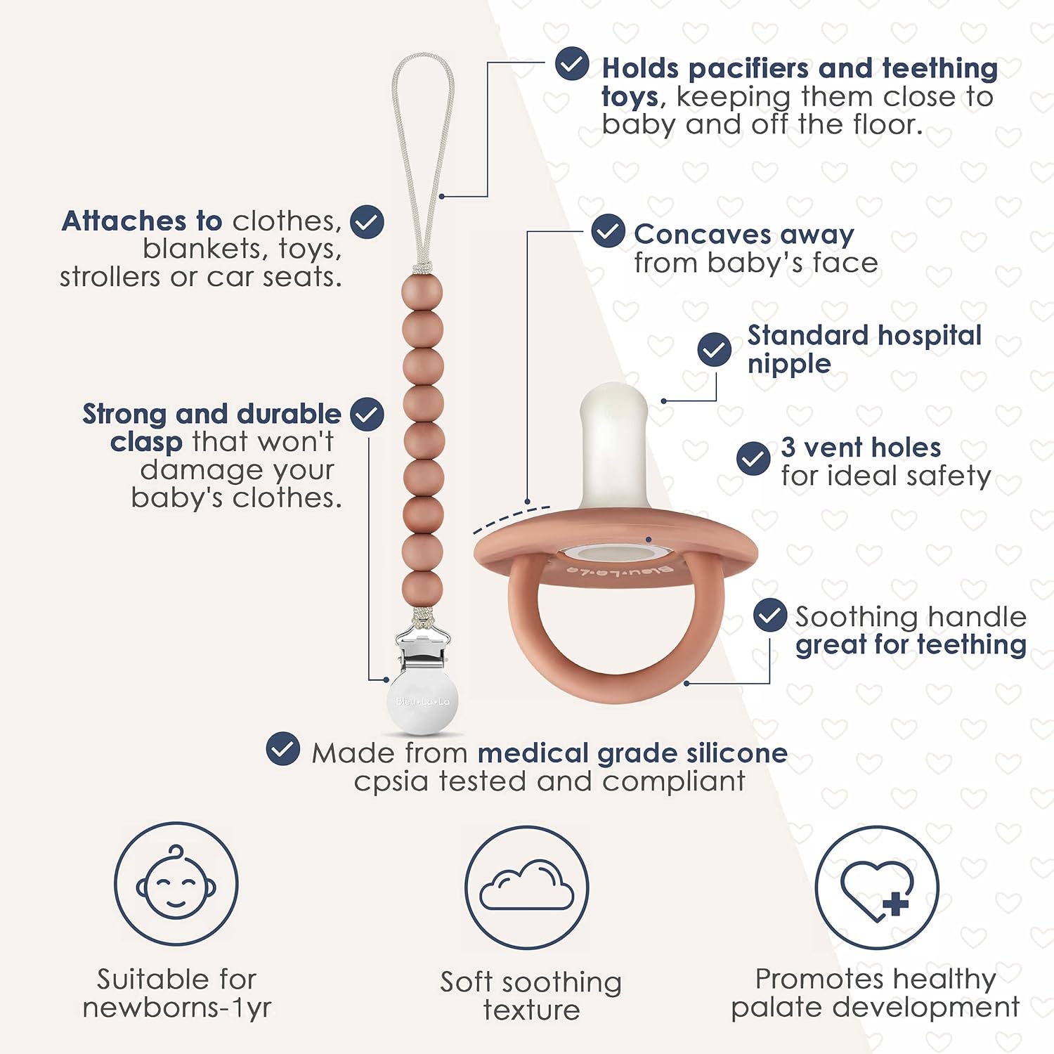 Complimentary Practical Case: Soft to the touch, user-friendly, and stylishly designed, our pacifier case features a robust zipper that keeps your baby’s binky clean and secure when not in use. With a large capacity, it accommodates 2 pacifiers and a clip, easily fastening onto purses, diaper bags, or strollers for convenient access.