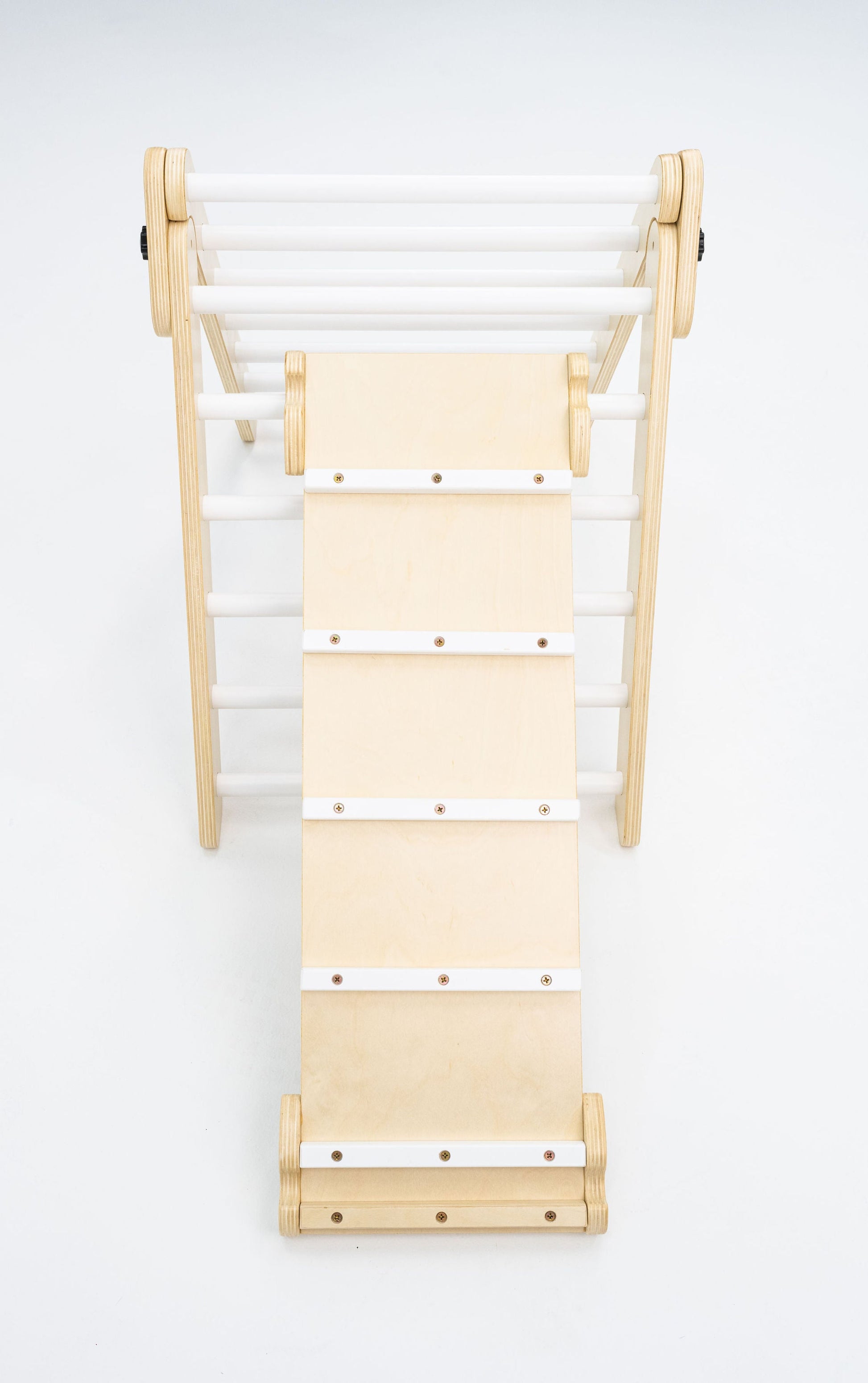 This climbing triangle encourages your little one to freely explore in a safe environment, fostering self-confidence and body autonomy. This wooden Pikler-inspired climber enhances balance control, develops motor skills, and encourages active and imaginative play. Get ready for endless fun! It can be used for climbing, sliding, building bridges, creating forts, and more.