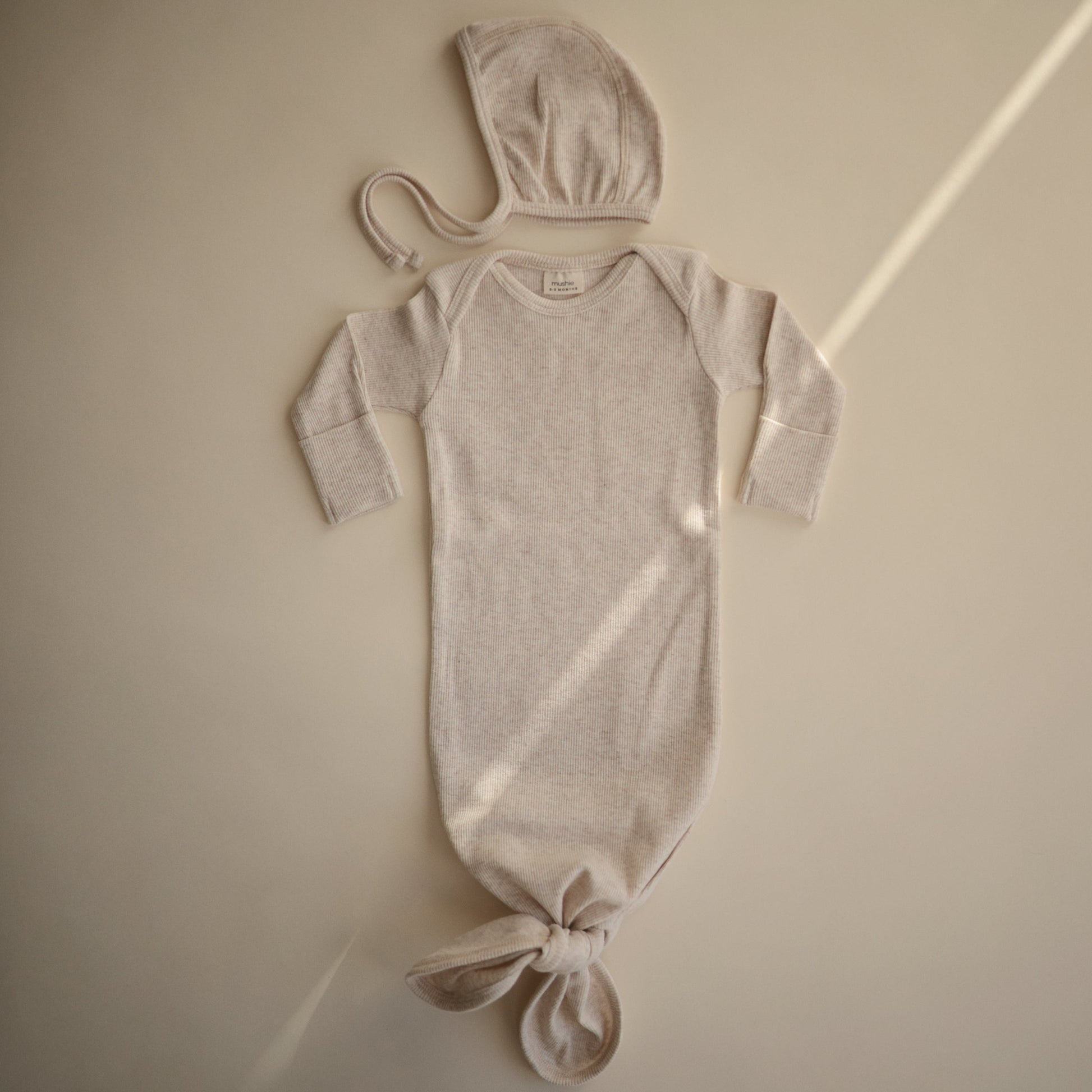 Pairs well with the Mushie Ribbed Knotted Baby Gown.