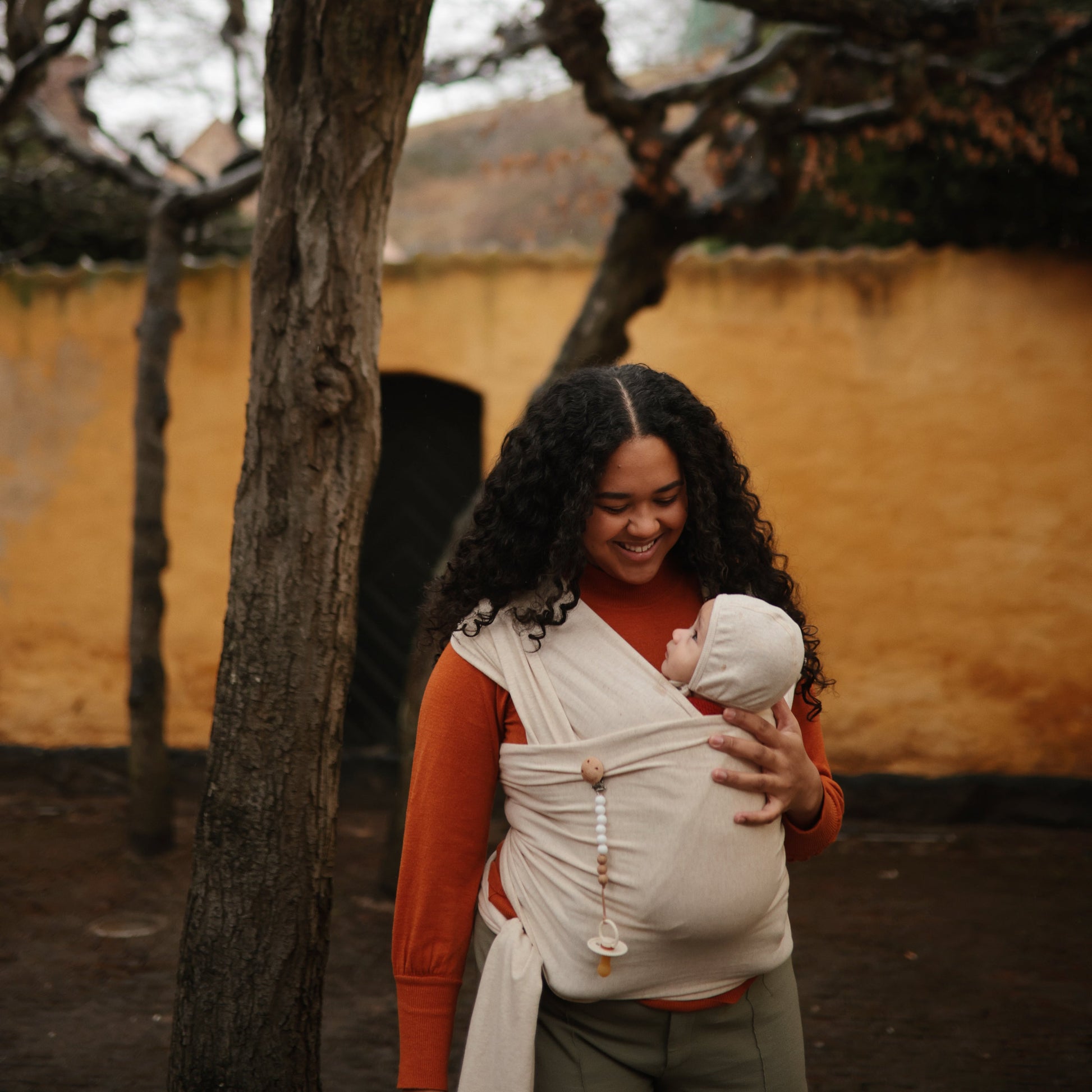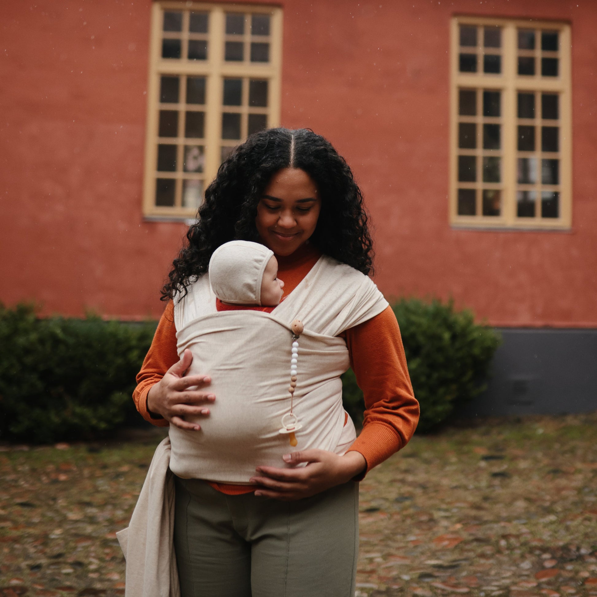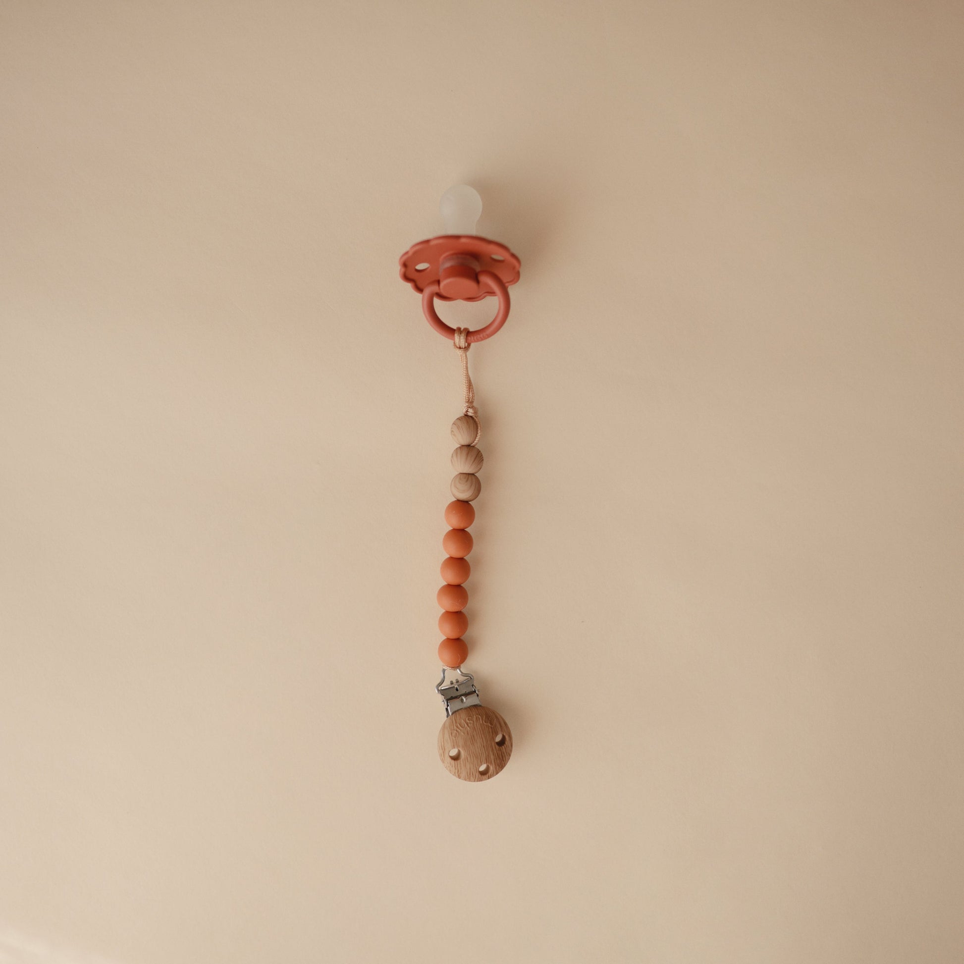 The Mushie silicone pacifier clip offers durability, function and simplicity to families on-the-go. Made from 100% food-grade silicone, our clip features a faux wood silicone clasp that brings a modern take to a traditional favorite. With a simple stack of silicone beads in two complementary colors, the Eva clip offers a sophisticated touch to your pacifier accessories. The clip is easy to clean and helps keep soothing items in reach for little ones.