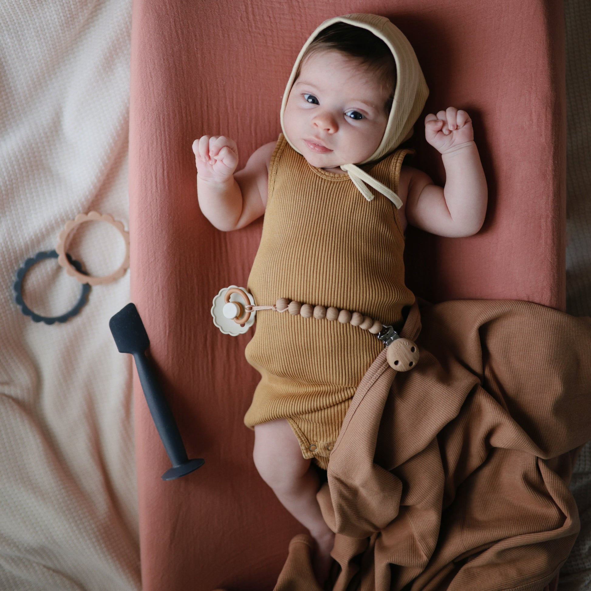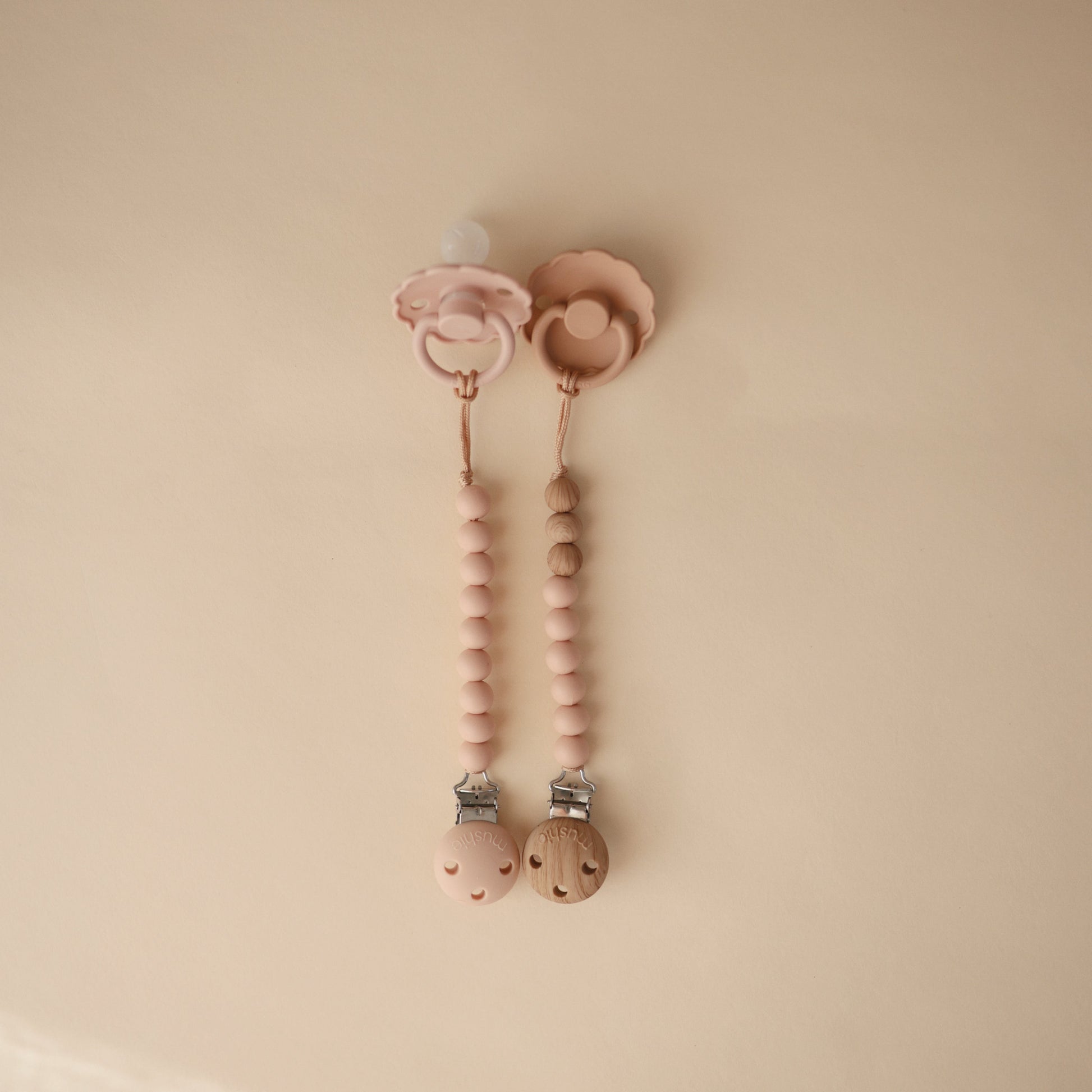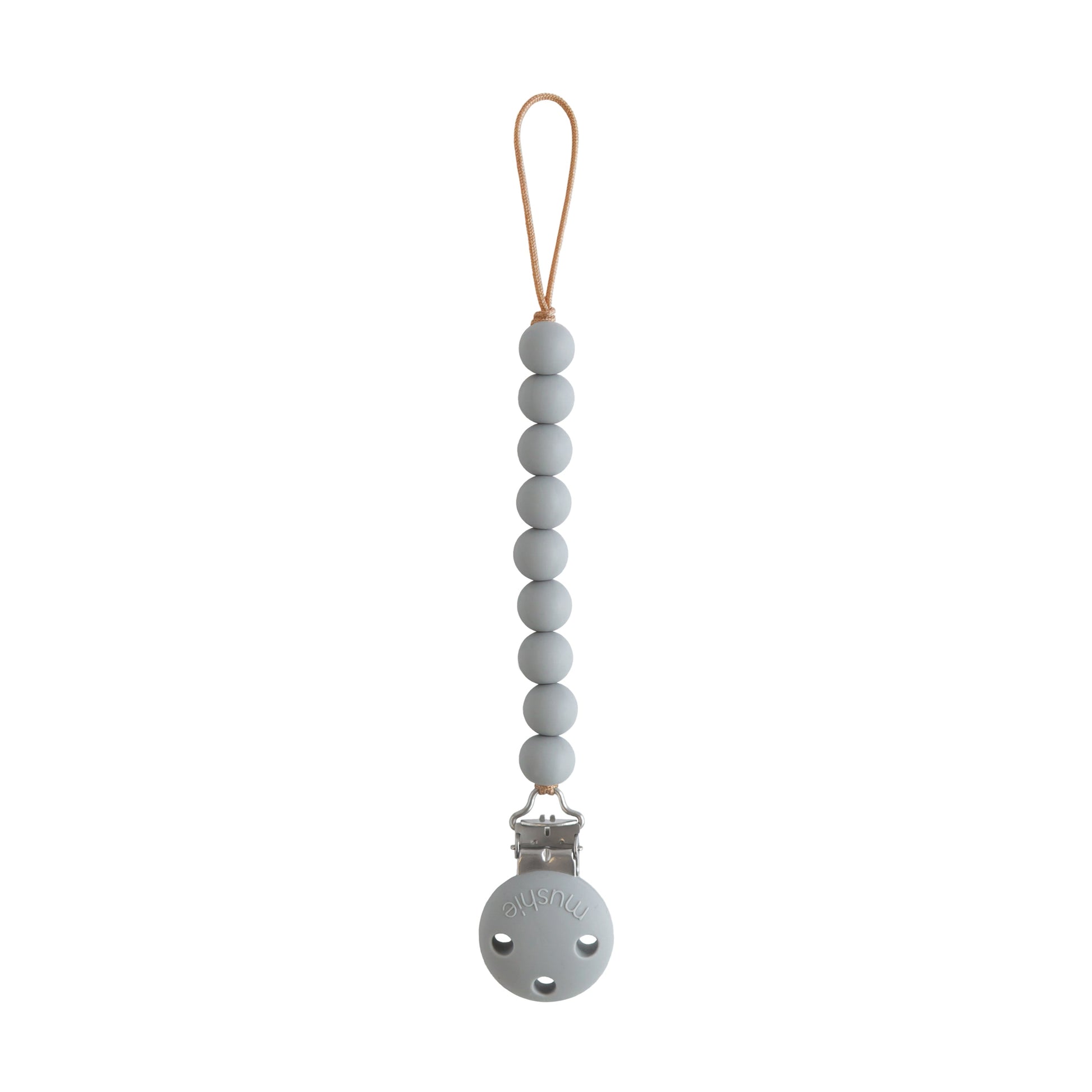 The Mushie silicone pacifier clip offers durability, function and simplicity to families on-the-go. Made from 100% food-grade silicone, our clip features a silicone clasp that brings a modern take to a traditional favorite. With a single color stack of silicone beads, the Hera clip offers families a beautiful accessory in a minimalist design. The clip is easy to clean and helps keep soothing items in reach for little ones.