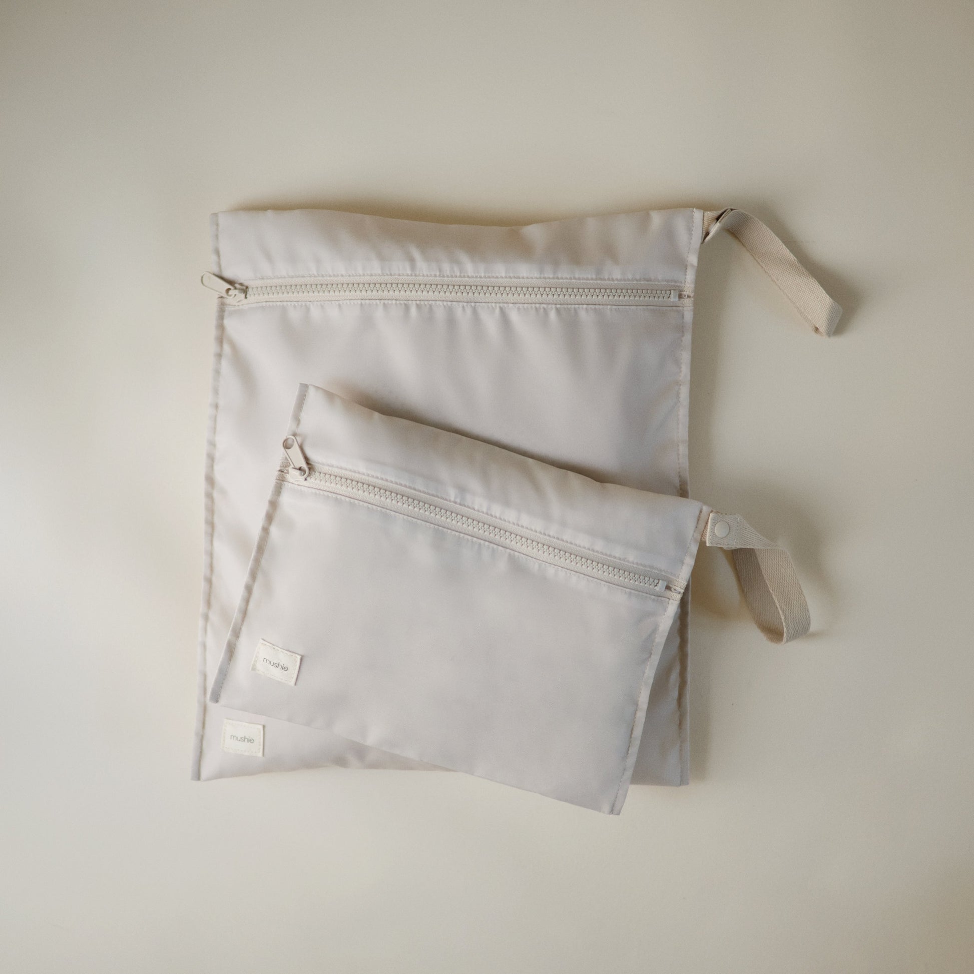 Whether dealing with wet swimsuits or dirty clothes, parents can be prepared for any adventures that come their little’s way with a set of Mushie wet bags. Featuring a zipper closure and machine washable, water resistant material, our wet bags were designed to help tackle messy situations on the go. The handles include a snap closure to easily hang or attach to a stroller. Each set offers two different sizes, making these a convenient storage solution to include in a diaper bag or school bag.
