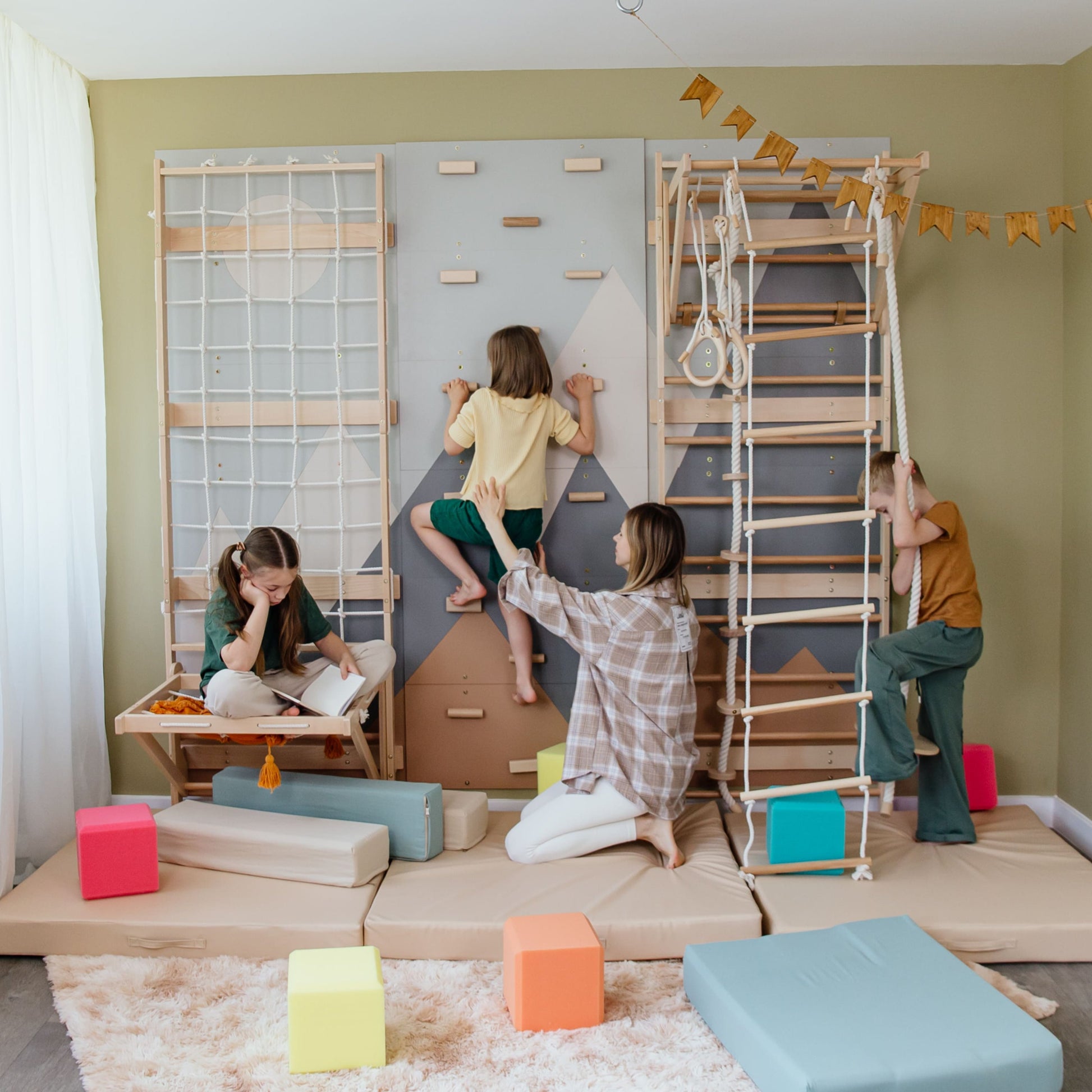 Maximize play and fitness at home! The Swedish Ladder Wall Gym combines climbing, swinging, and balance training in one multifunctional setup for kids 3+ and even adults!