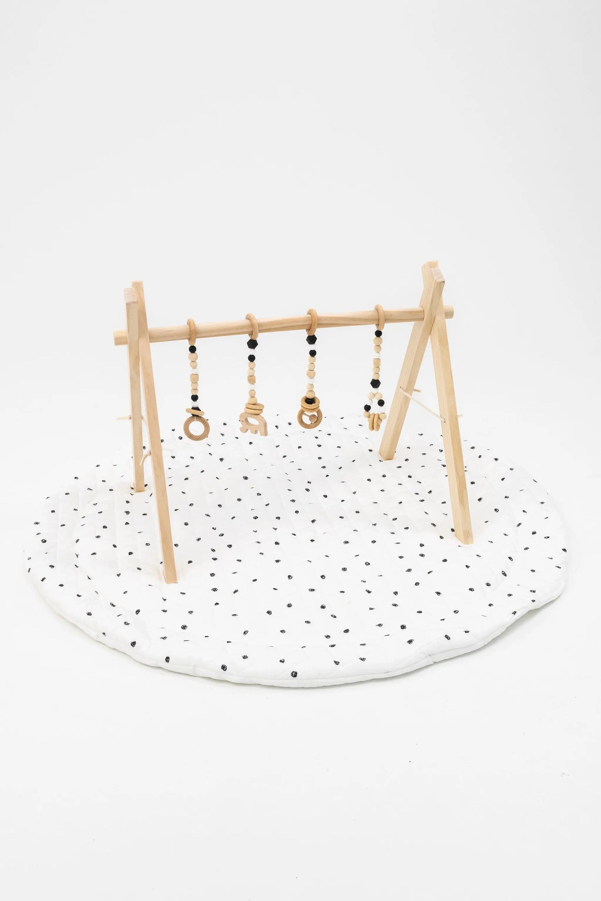 Enhance your baby's playtime with our Play Gym Set, an ideal combination of our popular Wooden Baby Gym and Padded Play Mat. Made from all-natural pine wood and non-toxic, food-grade silicone, the Wooden Baby Gym features four stimulating toys that encourage sensory development and hand-eye coordination. Its foldable design allows for convenient storage, and the natural wood frame with white toys adds a contemporary touch to any nursery decor.